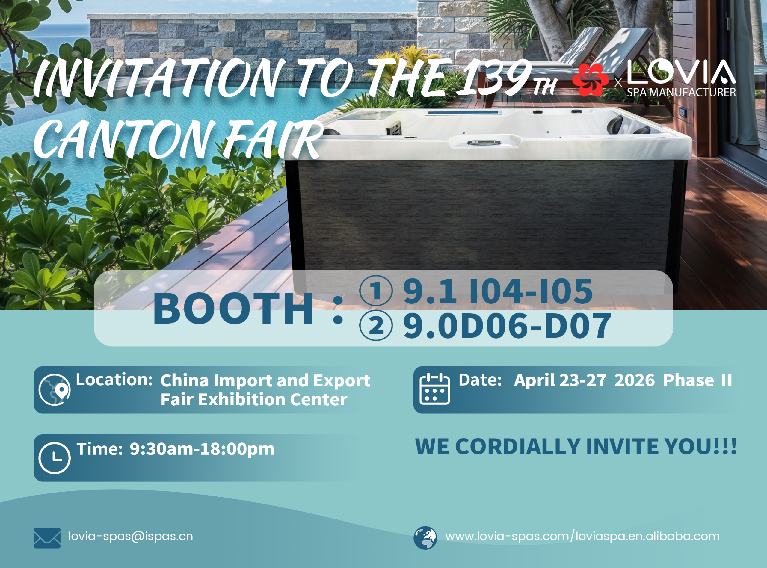 As global demand for affordable luxury and at-home hydrotherapy continues to surge, LOVIA Spas brings cutting-edge spa technology to buyers seeking the perfect balance of energy efficiency, therapeutic performance, and premium craftsmanship. Meet us at Booth 9.1 I04–I05 and Booth 9.0 D06–D07 from April 23–27, 2026 (9:30 AM – 6:00 PM daily) at the China Import and Export Fair Exhibition Center.